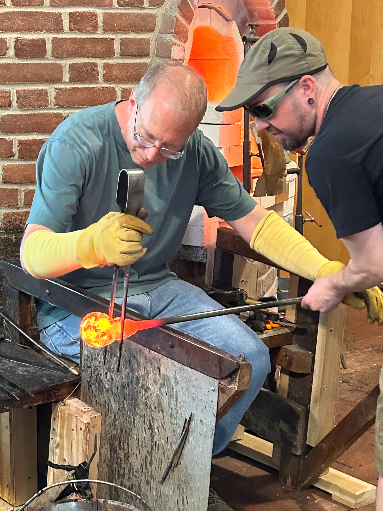 During your session you will sit beside the furnace while a professional glassblower guides you through each step of creating your piece. You’ll assist with shaping the molten glass and experience the heat, tools, and teamwork involved in working in a hot shop.