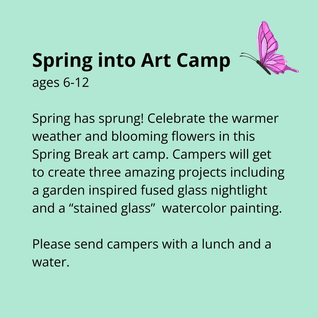 Spring has sprung! Celebrate the warmer weather and blooming flowers in this Spring Break art camp. Campers will get to create three amazing projects including a garden inspired fused glass nightlight and a "stained glass" watercolor painting.