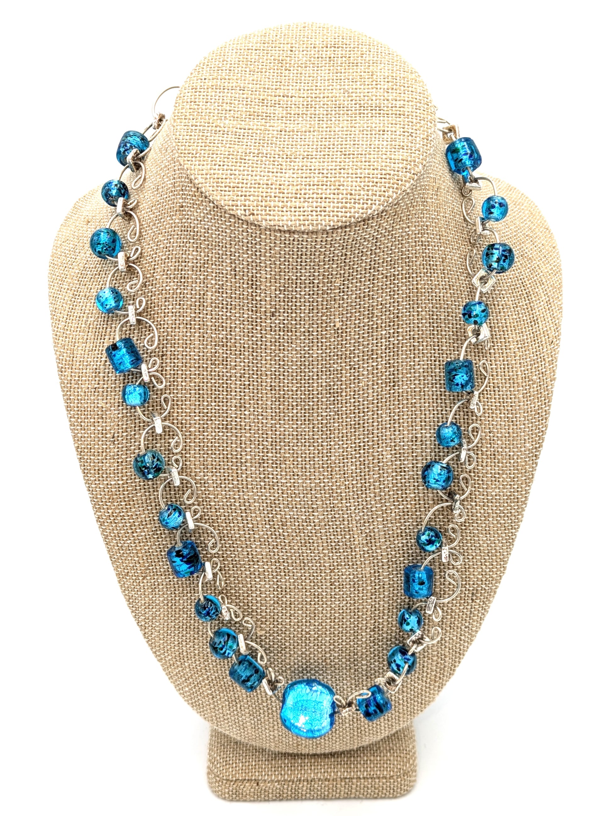 Made of sterling silver wire links threaded with foil and Venetian glass beads. Links are also sterling silver.